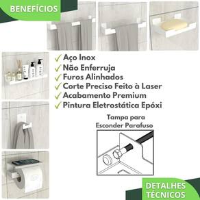 Com um design minimalista, o preferido pelos arquitetos nos últimos tempos, o Kit Acessórios Para Banheiro é fabricado utilizando aço inox com acabamento em Pintura Eletrostática Epóxi proporcionando maior durabilidade, resistência e garantindo que não ocorrerá oxidação nem ferrugem.