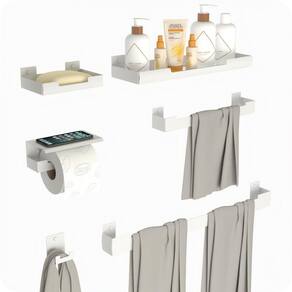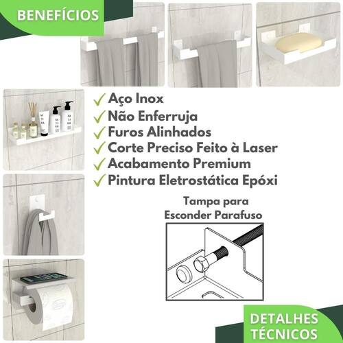 ITENS INCLUSOS 1 Porta Toalha de Banho 1 Porta Toalha de Rosto 1 Porta Papel Higiênico 1 Porta Shampoo 1 Gancho 1 Saboneteira Parafusos e buchas para instalação Tampas para esconder os parafusos