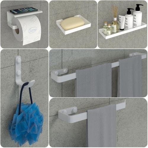 As peças do kit possuem um design clean e sofisticado, suas barras são de alumínio maciço, o porta shampoo e porta sabonetes são de aço inox, ambos com acabamento em pintura eletrostática epóxi branca garantindo maior durabilidade e resistência, não havendo problemas com ferrugem.