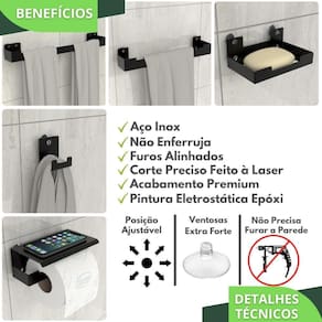 Com um design minimalista, o preferido pelos arquitetos nos últimos tempos, o Kit Acessórios é fabricado utilizando aço inox com acabamento em Pintura Eletrostática Epóxi proporcionando maior durabilidade, resistência e garantindo que não ocorrerá oxidação nem ferrugem.