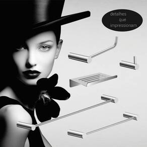 ITENS ENVIADOS: 1 cabide, 1 porta papel higiênico, 1 toalheiro rosto 30cm, 1 toalheiro banho 50cm, 1 saboneteira, kit de parafusos e manual instrução instalação.