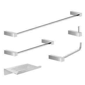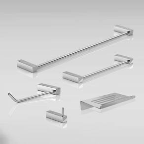 ITENS ENVIADOS: 1 cabide, 1 porta papel higiênico, 1 toalheiro rosto 30cm, 1 toalheiro banho 50cm, 1 saboneteira, kit de parafusos e manual instrução instalação.
