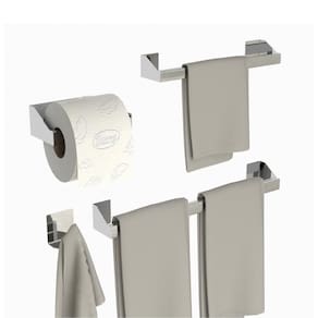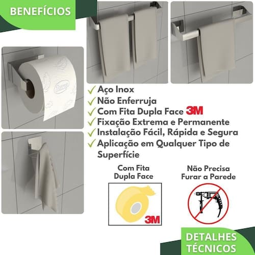 Kit Acessórios Para Banheiro Inox 4 Peças Master Slim DF O Kit Acessórios Para Banheiro Dupla Face foi projetado para quem não quer furar a parede e busca por qualidade na fixação e boa aderência em ambientes molhados.Prezando pela sofisticação e elegância, cada traço do produto foi cuidadosamente desenhado para deixar seu banheiro com um visual clean e sofisticado. Com um design minimalista, o preferido pelos arquitetos nos últimos tempos, o Kit Acessórios Para Banheiro é fabricado utilizando aço inox com acabamento polido em alto brilho proporcionando maior durabilidade, resistência e garantindo que não ocorrerá oxidação nem ferrugem. A fixação é feita com fita dupla face da marca 3M produzida sob medida personalizada para o produto, garantindo mais firmeza e estabilidade. Após remover a fita e colar o produto na parede, aguarde 20minutos e em seguida o produto já pode ser utilizado. Seu processo de acabamento é feito em polimento de alta temperatura, o que garante um alto padrão de brilho, dando um toque especial na decoração do seu banheiro. BENEFÍCIOSFixação: Fita Dupla FaceAcabamento Premium: Corte Realizado à LaserMaterial de Aço InoxResistente a ÁguaNão Enferruja e não sofre oxidação ESPECIFICAÇÕES TÉCNICASMaterial: Aço InoxAcabamento: Polido em Alta TemperaturaCor: Alto BrilhoQuantidade de Peças do Kit: 04 MEDIDASPorta Toalha de Banho: 5cm x 44cm x 5,5cmPorta Toalha de Rosto: 5cm x 30cm x 5,5cmPorta Papel Higiênico: 9cm x 15cm x 6cmGancho: 3,5cm x 3cm x 4,5cm ITENS INCLUSOS1 Porta Toalha de Banho1 Porta Toalha de Rosto1 Porta Papel Higiênico1 Gancho Todos os itens já vão com fita de dupla face da marca 3M.