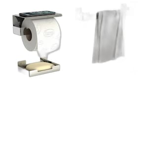 ITENS INCLUSOS 1 Porta Toalha de Banho 1 Porta Toalha de Rosto 1 Porta Papel Higiênico 1 Gancho 1 Saboneteira Parafusos e buchas para instalação Tampas para esconder os parafusos