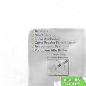 BENEFÍCIOS Fixação forte: Sistema duplo de fixação Acabamento Premium: Corte Realizado à Laser Material de Aço Inox Resistente a Água Não Enferruja e não sofre oxidação Furos alinhados com parafusos sextavados, facilitando o acesso da ferramenta, tornando a instalação muito simples e rápida Tampa de acabamento para esconder as cabeças dos parafusos