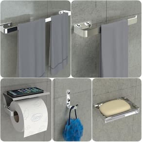 Kit Acessórios Para Banheiro Inox e Cromado 5 Peças MAX Ter um banheiro organizado traz leveza e praticidade para sua rotina. Para que o banheiro fique em ordem, é necessário o uso de alguns produtos. O Kit de Acessórios para Banheiro MAX é super indicado pois contém 5 peças para a harmonização do seu ambiente.