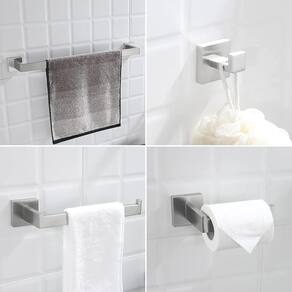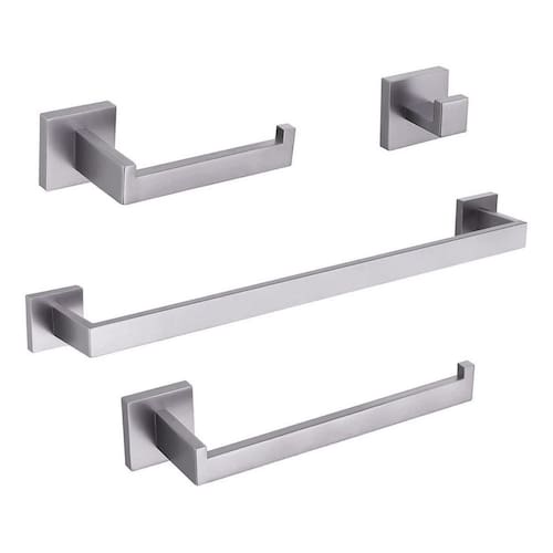 Cor: prata Material: aço inoxidável 304 - escovado Espessura das peças: 1 cm. Tipo de fixação: dupla com parafusos Itens inclusos: papeleira, cabide, porta toalha de rosto e porta toalha de banho. Acompanha: parafusos e buchas para instalação Marca: Não Informado