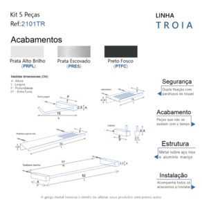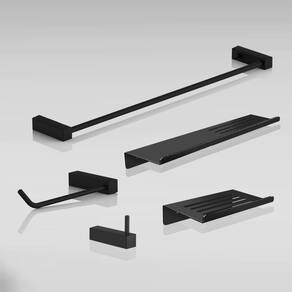 ITENS ENVIADOS: 1 cabide, 1 porta papel higiênico, 1 toalheiro banho 50cm, 1 saboneteira, 1 prateleira suporte reta 30cm, kit de parafusos e manual instrução instalação.