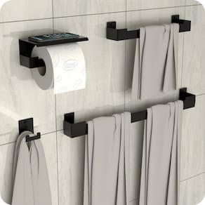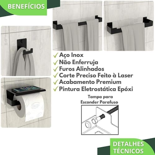 Kit Acessórios Para Banheiro Preto Fosco 4 Peças ELG Banheiros modernos exigem produtos de qualidade. Prezando pela sofisticação e elegância, desenvolvemos o Kit Acessórios Para Banheiro Elegance, onde cada traço foi cuidadosamente desenhado para deixar seu banheiro com um visual clean e sofisticado. Com um design minimalista, o preferido pelos arquitetos nos últimos tempos, o Kit Acessórios Para Banheiro é fabricado utilizando aço inox com acabamento em Pintura Eletrostática Epóxi Fosca proporcionando maior durabilidade, resistência e garantindo que não ocorrerá oxidação nem ferrugem. O sistema de dupla fixação garante mais firmeza ao produto e mais estabilidade, evitando que a peça se desloque de um lado para a outro. BENEFÍCIOSFixação forte: Sistema duplo de fixaçãoAcabamento Premium: Corte Realizado à LaserMaterial de Aço InoxResistente a ÁguaNão Enferruja e não sofre oxidaçãoFuros alinhados com parafusos sextavados, facilitando o acesso da ferramenta, tornando a instalação muito simples e rápidaTampa de acabamento para esconder as cabeças dos parafusos ESPECIFICAÇÕES TÉCNICASMaterial: Aço InoxAcabamento: Pintura Eletrostática EpóxiCor: Preto FoscoQuantidade de Peças do Kit: 04 MEDIDASPorta Toalha de Banho: 5cm x 44cm x 5,5cmPorta Toalha de Rosto: 5cm x 30cm x 5,5cmPorta Papel Higiênico: 9cm x 15cm x 6cmGancho: 3,5cm x 3cm x 4,5cm ITENS INCLUSOS1 Porta Toalha de Banho1 Porta Toalha de Rosto1 Porta Papel Higiênico1 GanchoParafusos e buchas para instalaçãoTampas para esconder os parafusos Todos os itens acompanham parafusos, buchas e tampas de acabamento para esconder a cabeça do parafuso.