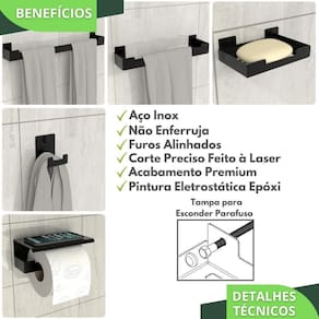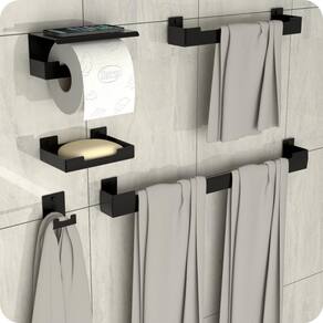 Kit Acessórios Para Banheiro Preto Fosco 5 Peças ELG Banheiros modernos exigem produtos de qualidade. Prezando pela sofisticação e elegância, desenvolvemos o Kit Acessórios Para Banheiro Elegance, onde cada traço foi cuidadosamente desenhado para deixar seu banheiro com um visual clean e sofisticado. Com um design minimalista, o preferido pelos arquitetos nos últimos tempos, o Kit Acessórios Para Banheiro é fabricado utilizando aço inox com acabamento em Pintura Eletrostática Epóxi Fosca proporcionando maior durabilidade, resistência e garantindo que não ocorrerá oxidação nem ferrugem. O sistema de dupla fixação garante mais firmeza ao produto e mais estabilidade, evitando que a peça se desloque de um lado para a outro. BENEFÍCIOSFixação forte: Sistema duplo de fixaçãoAcabamento Premium: Corte Realizado à LaserMaterial de Aço InoxResistente a ÁguaNão Enferruja e não sofre oxidaçãoFuros alinhados com parafusos sextavados, facilitando o acesso da ferramenta, tornando a instalação muito simples e rápidaTampa de acabamento para esconder as cabeças dos parafusos ESPECIFICAÇÕES TÉCNICASMaterial: Aço InoxAcabamento: Pintura Eletrostática EpóxiCor: Preto FoscoQuantidade de Peças do Kit: 05 MEDIDASPorta Toalha de Banho: 5cm x 44cm x 5,5cmPorta Toalha de Rosto: 5cm x 30cm x 5,5cmPorta Papel Higiênico: 9cm x 15cm x 6cmGancho: 3,5cm x 3cm x 4,5cmSaboneteira: 3,5cm x 12cm x 7,5cm ITENS INCLUSOS1 Porta Toalha de Banho1 Porta Toalha de Rosto1 Porta Papel Higiênico1 Gancho1 SaboneteiraParafusos e buchas para instalaçãoTampas para esconder os parafusos Todos os itens acompanham parafusos, buchas e tampas de acabamento para esconder a cabeça do parafuso.