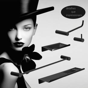 O kit de acessórios para banheiro da linha Orion possui um design versátil, são peças que se destacam com minimalismo. ;