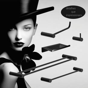 ITENS ENVIADOS: 1 cabide, 1 porta papel higiênico, 1 toalheiro rosto 30cm, 1 toalheiro duplo 60cm, 1 saboneteira, kit de parafusos e manual instrução instalação.