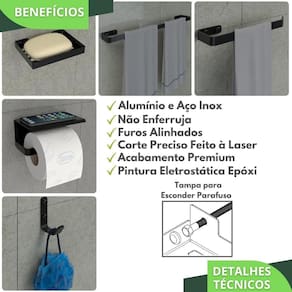 As peças do kit possuem um design clean e sofisticado, suas barras são de alumínio maciço, o porta shampoo e porta sabonetes são de aço inox, ambos com acabamento em pintura eletrostática epóxi preto fosco garantindo maior durabilidade e resistência, não havendo problemas com ferrugem.
