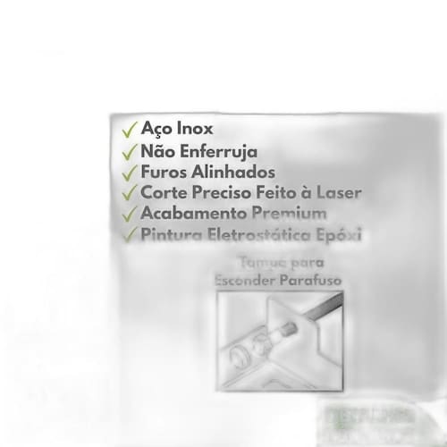 BENEFÍCIOS Fixação forte: Sistema duplo de fixação Acabamento Premium: Corte Realizado à Laser Material de Aço Inox Resistente a Água Não Enferruja e não sofre oxidação Furos alinhados com parafusos sextavados, facilitando o acesso da ferramenta, tornando a instalação muito simples e rápida Tampa de acabamento para esconder as cabeças dos parafusos