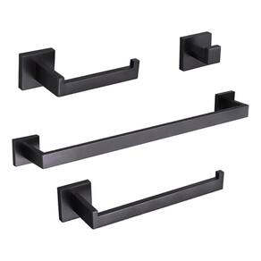 Cor: preto Material: aço inoxidável 304 Espessura das peças: 1 cm. Tipo de fixação: dupla com parafusos Itens inclusos: papeleira, cabide, porta toalha de rosto e porta toalha de banho. Acompanha: parafusos e buchas para instalação Marca: Não Informado