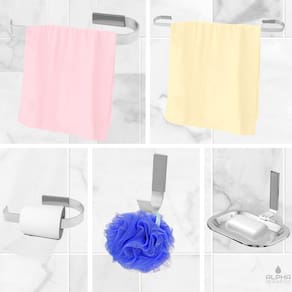01 porta toalha de banho 01 porta toalha de rosto 01 cabide simples 01 saboneteira 01 papeleira + parafusos e buchas para instalação