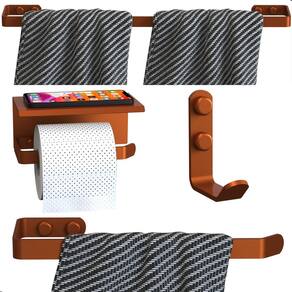 Material Reforçado - Aço carbono de alta resistência, ideal para uso diário Não Enferruja Fácil - Acabamento premium que protege contra umidade e corrosão Design Clean e Sofisticado - Cor Rose Gold para um visual moderno e elegante Instalação Prática - Furos alinhados, parafusos sextavados e tampas de acabamento para um acabamento impecável Funcional - porta papel higiênico com prateleira superior para apoiar celular, aromatizador ou pequenos itens decorativos