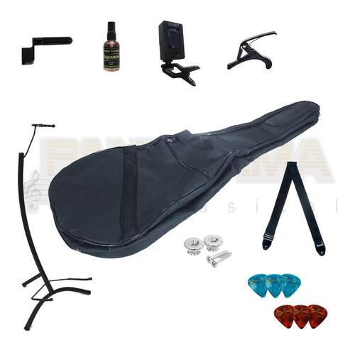 Este kit contém os seguintes itens:capa violao folk simples,limpador de cordas,2 roldanas,encordoador,suporte,capotraste, afinador digital, correia, 6 pahetas Marca: Não Informado Ean: 9000007808358