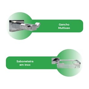 Itens inclusos: - 1x Porta toalha de banho duplo - 1x Cabide - 1x Porta papel higiênico - 1x Gancho multiúso - 1x Saboneteira - Kit Parafusos e buchas para instalação