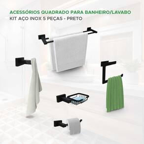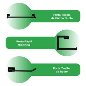 Itens inclusos: - 1x Porta toalha de banho duplo - 1x Cabide - 1x Porta papel higiênico - 1x Gancho multiúso - 1x Saboneteira - Kit Parafusos e buchas para instalação