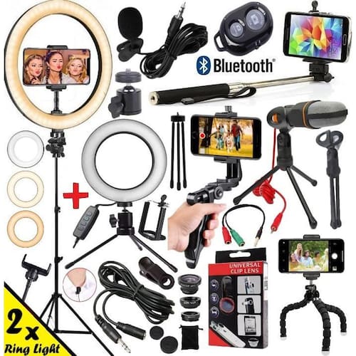 Kit acessórios youtuber completo 15x1 tripé microfone lapela celular anel luz ring light estabilizador gravação de vídeo atenção só compre produtos com kit 15x1 completo o único com 2 ring lights ring light led 10 polegadas 26cm 3 cores e 10 níveis de intensidade de luz + tripé com altura até 2,10 metros + ring light 16cm de mesa rotação 360 graus que permite gravações na vertical e horizontal. Kit profissional,o mais completo do mercado,de qualidade e com eletrônica.São 15 itens incluindo tripé todo em alumínio para melhor qualidade de seus vídeos e fotos. O kit contém: 1 microfone de lapela 1 microfone condensador de mesa acompanha tripé 1 tripé de até 2,10m de alcance para celular,câmera ou ring light 1 adaptador para usar o celular nos tripés 1 iluminador led circular 26cm 1 adaptador p2 1 cabo extensor de 3 metros 1 mini tripé flexível 1 mini tripé para o ring light 1 tripé monopod steadicam 1 kit de lentes olho de peixe wild, macro e fisheye 1 controle bluetooth 1 ball head permite rotação de 360º do ring 1 de selfie 1 iluminador led circular 16cm O adaptador permite que o microfone de lapela seja utilizado Em celulares ou em aparelhos que não tenham entrada para plug p2 de 3 vias comprimento do cabo do microfone: 1 metro. comprimento do cabo extensor : 3 metros. totalizando 4 metros. O microfone condensador de alta sensibilidade profissional é um dos mais completos do mercado, com ótimo custo benefício. Ideal para e amador, exercendo suas gravações com maestria. Possui conexão p2 padrão de microfone, o que torna o uso universal seja em pc,notebook,também acompanha adaptador para usar o microfone em celulares.O extensor também pode ser no microfone condensador se necessário. Iluminador ring light de 26 centímetros, desenvolvido para maquiadores, fotógrafos, cinegrafistas e etc, que buscam uma ótima maneira de iluminar com perfeição. Ring light led é um iluminador com ajuste de até 10 níveis de intensidade de luz, 03 tonalidades de cor, quente, fria e mesclada quente e fria ao mesmo tempo , alimentado através de um cabo usb, devendo estar sempre conectado a uma fonte de energia para acender. A base composta por um tripé, um encaixe articulado, o que possibilita fácil ajuste de altura e do ângulo que deseja posicionar sua luz. Todas as peças são encaixadas através de rosca. Aviso: entrada usb do produto é compatível com fonte/carregador de celular. está incluso também o suporte pra colocar o celular no meio do ring light Controle remoto bluetooth celular É um produto que foi desenvolvido para facilitar a vida dos usuários de smartphones que adoram tirar aquela selfie sozinho ou com a galera. Com ele, você pode facilmente tirar fotos ou fazer vídeos sem precisar tocar no seu aparelho. Atenção a cor do controle bluetooth, de selfie e do mini tripé é escolhida aleatoriamente, conforme a disponibilidade em O melhor kit custo benefício.