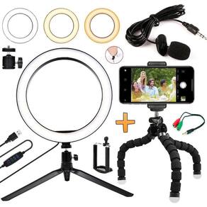 Kit acessórios para youtuber tripé profissional celular câmera microfone lapela luz iluminador ring light + bluetooth