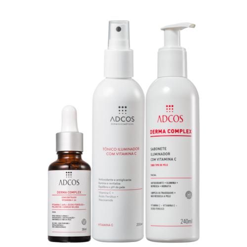 Adcos Derma Complex Vitamina C - Tônico Iluminador Facial 200ml: promove recuperação inteligente da pele desvitalizada e estimula a produção de colágeno através de Flavonóides e Lactonas especiais. Possui ainda 11 Aminoácidos nutritivos, Niacinamida, que hidrata, protege o colágeno (antiglicante) e auxilia no controle da oleosidade.