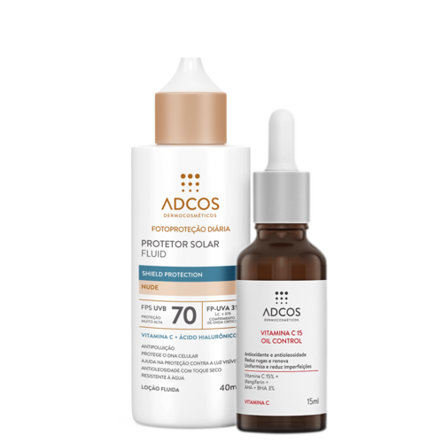 O Kit Adcos Proteção Diária + Vitamina C 15 conta com o Sérum Facial, que possui 10% de Vitamina C pura, um potente antioxidante que estimula a síntese de colágeno e reduz rugas. Além disso, o seu Protetor Solar apresenta uma textura leve, sendo ideal para reduzir os poros e controlar a oleosidade, sem ressecar.