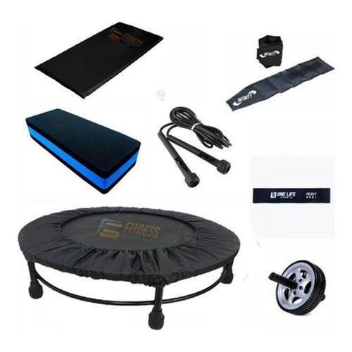 Kit aeróbico jump+colchonete +corda + caneleira + step+ capa Detalhes do produto Mini jump profissional 32 molas com aro de reforço - cheers O jump profissional - cama elástica trampolim é ideal para o uso em academias, condomínios e residências, além de queimar calorias de forma eficiente. Confeccionado em tubo redondo de aço com aro de reforço, possui pintura em epóxi e tem os pé fixos . São 32 molas para você manter o corpo em forma de uma maneira divertida e saudável. As molas são fixadas á tela por 16 suportes de aço. Pés em pvc antiderrapantes removíveis que se encaixam. O colchonete profissional 90 x 45 x 3 cm é ideal para ter mais conforto na hora de fazer seus exercícios, praticar yoga, pilates ou qualquer exercício funcional. Ele é super prático, fácil de guardar, e é fabricado em espuma de 20 mm com densidade d16, sendo confortável na medida certa. No exterior, é revestido em napa lavável e impermeável, o que facilita quando houver necessidade de higienização e no excesso de suor na prática de exercícios. Você vai se sentir mais confortável para fazer abdominais e outras atividades físicas, além de seu uso ser indispensável para proteger a coluna e evitar lesões. Ações e benefícios: - confortável com enchimento em espuma 20mm de densidade d16 - leve e prático para transporte e armazenamento - tecido lavável e impermeável garante durabilidade do produto - ideal para quaisquer exercícios, prática de yoga, pilates e outras atividades Indicações: - prevenir a coluna e o corpo de lesões em exercícios no solo - ideal para ter mais conforto na prática de quaisquer atividades esportivas Dados técnicos: Tamanho: 90 x 45 x 2 cm Marca: fitness store Material: revestimento em napa com enchimento em espuma 30mm de densidade d23 : 3 meses contra defeito de fabricação Cor: preto Indicações Ideal para o uso em academias, condomínios e residências. Indicado para . Caneleira de peso 3 kg é ideal para a prática de exercícios de ginástica, academia, musculação, etc com peso. São caneleiras profissionais com carga, feitas em capota reforçado, dando mais conforto ao tornozelo. Não absorve suor, é fácil de limpar e higienizar . Possui uma costura dupla de reforço, evitando o vazamento do enchimento. Seu sistema de fechamento é feito em tiras aderentes, garantindo facilidade e segurança na hora de prender a caneleira na perna. Características: Cor: preto Lavável: sim Sistema de fechamento: tiras aderentes Outros: confortável ao tornozelo, não absorve suor, fácil de higienizar, possui costura reforçada evitando o vazamento do enchimento. Membros ou músculos trabalhados: coxas, abdômens, glúteos, panturrilhas e braços. Material: emborrachado Quantidade: 01 - par caneleira de 3kg Kit composto por: 1- mini jump 1- colchonete 90x45x2 cm 1- corda de pvc 1- par de caneleira de 3 kg 1- step de eva 60cm x 30cm x 10cm 1 - roda abdominal 1 - mini band extra forte 1- capa para jump