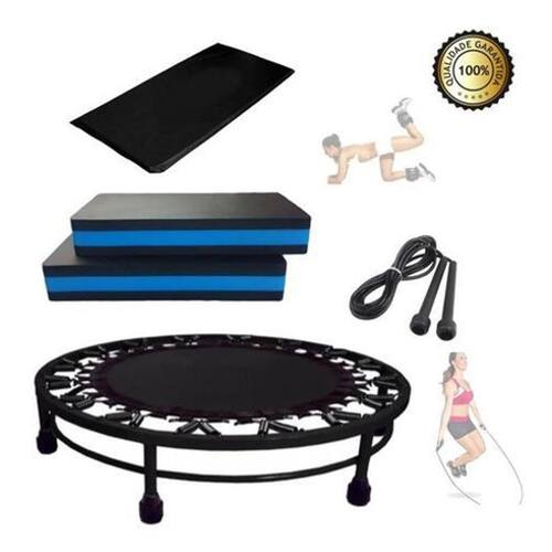 Kit aeróbico mini jump+colchonete +corda + 2steps Detalhes do produto Mini jump 32 molas com aro de reforço - cheers O jump - cama elástica trampolim é ideal para o uso em academias, condomínios e residências, além de queimar calorias de forma eficiente. Confeccionado em tubo redondo de aço com aro de reforço, possui pintura em epóxi e tem os pé fixos . São 32 molas para você manter o corpo em forma de uma maneira divertida e saudável. As molas são fixadas á tela por 16 suportes de aço. Pés em pvc antiderrapantes removíveis que se encaixam. O colchonete 90 x 45 x 2 cm é ideal para ter mais conforto na hora de fazer seus exercícios, praticar yoga, pilates ou qualquer exercício funcional. Ele é super prático, fácil de guardar, e é fabricado em espuma de 20 mm com densidade d16, sendo confortável na medida certa. No exterior, é revestido em napa lavável e impermeável, o que facilita quando houver necessidade de higienização e no excesso de suor na prática de exercícios. Você vai se sentir mais confortável para fazer abdominais e outras atividades físicas, além de seu uso ser indispensável para proteger a coluna e evitar lesões. Ações e benefícios: - confortável com enchimento em espuma 20mm de densidade d16 - leve e prático para transporte e armazenamento - tecido lavável e impermeável garante durabilidade do produto - ideal para quaisquer exercícios, prática de yoga, pilates e outras atividades Indicações: - prevenir a coluna e o corpo de lesões em exercícios no solo - ideal para ter mais conforto na prática de quaisquer atividades esportivas Dados técnicos: Tamanho: 90 x 45 x 2 cm Marca: fitness store Material: revestimento em napa com enchimento em espuma 30mm de densidade d23 : 3 meses contra defeito de fabricação Cor: preto Indicações Ideal para o uso em academias, condomínios e residências. Indicado para . Kit composto por: 1- mini jump 1- colchonete 90 x 45 x 2 cm 1- corda de pvc 2- step de eva 60cm x 30cm x 10cm