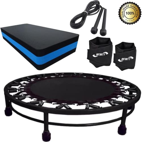 Kit aeróbico mini jump + corda + caneleira 4kg + step Detalhes do produto Mini jump 32 molas com aro de reforço - cheers O jump - cama elástica trampolim é ideal para o uso em academias, condomínios e residências, além de queimar calorias de forma eficiente. Confeccionado em tubo redondo de aço com aro de reforço, possui pintura em epóxi e tem os pé fixos . São 32 molas para você manter o corpo em forma de uma maneira divertida e saudável. As molas são fixadas á tela por 16 suportes de aço. Pés em pvc antiderrapantes removíveis que se encaixam. caneleira de peso 4 kg é ideal para a prática de exercícios de ginástica, academia, musculação, etc com peso. São caneleiras profissionais com carga, feitas em capota reforçado, dando mais conforto ao tornozelo. Não absorve suor, é fácil de limpar e higienizar . Possui uma costura dupla de reforço, evitando o vazamento do enchimento. Seu sistema de fechamento é feito em tiras aderentes, garantindo facilidade e segurança na hora de prender a caneleira na perna. Características: Cor: preto Lavável: sim Sistema de fechamento: tiras aderentes Outros: confortável ao tornozelo, não absorve suor, fácil de higienizar, possui costura reforçada evitando o vazamento do enchimento. Membros ou músculos trabalhados: coxas, abdômens, glúteos, panturrilhas e braços. Material: emborrachado Quantidade: 01 - par caneleira de 4kg Kit composto por: 1- mini jump 1- corda de pvc 1- par de caneleira de 4 kg 1- step de eva 60cm x 30cm x 10cm