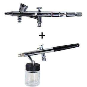 UR521K KIT AEROGRAFO DE GRAVIDADE DUPLA AÇÃO BICO 0.2MM/0.3MM/ 2ML + AEROGRAFO DE SUCÇÃO DUPLA AÇÃO 0.35MM/0.5MM /22ML - COM 15PÇS • Aerógrafo com bico 0.2mm para traços super fino. / Bico 0.3mm para traços fino à médio / Bico 0.35mm para traços médio/Bico 0.5mm para traços médios à largo • Sistema de ação dupla no gatilho para controlar o fluxo de ar e o volume de tinta, acionando para ‘’ baixo’’ liberação do ar / acionando para ‘’ trás’’ liberação da tinta; • Aerógrafo de gravidade: Com regulagem externa da agulha e botão frontal regulador de pressão para melhor ajuste ao trabalho. • Aerógrafo de gravidade: Botão traseiro para limitar e ajustar o gatilho determinando a quantidade de tinta que irá ser aplicada. • Equipamentos fabricados em metal cromado, super leves, resistentes a solventes e com maior durabilidade. • Copo fabricado em metal cromado com capacidade de 2ml e alimentação por gravidade. • Copo fabricado em vidro com tampa em ABS com capacidade de 22ml e alimentação por sucção. • Mangueira trançada com 1,8mtr para alimentação de ar • Equipamento ideal para pinturas em uso em geral; • Equipamento fornecido em estojo personalizado com berço em EVA para armazenamento.