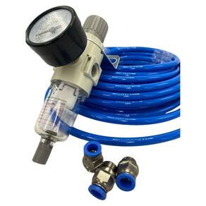 Kit afr2000 filtro 1/4 com manometro + conexão reta macho 1/4x6mm + mangueira pneumatica Conteúdo da embalagem: 01 - filtro regulador ar comprimido 1/4 - pn afr2000 10 - kit 10 conexao reta macho 1/4x06mm bsp 10 metros tubo em poliuretano azul 6x4mm Descrição do produto: o conjunto de preparação de ar tem o objetivo de regular, filtrar e lubrificar o ar comprimido. Modelo: afr2000 rosca g1/4 / fluido: ar / filtragem: 40 / pressão de trabalho: 0,510 bar pressão de ruptura: 12 bar /temp. De trabalho: 560/ drenagem: semi automática