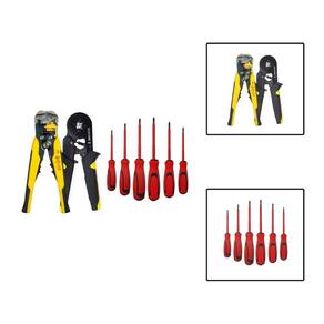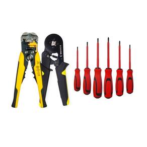 Especificações: - Marca: Bomvink; - Modelos: 1702 e 3110; - Quantidade de Ferramentas: 1 Alicate Crimpador Decapador, 1 Alicate Prensa Terminal e 6 Chaves Isoladas 3 Philips e 3 Fendas ; - Chaves com design ergonômico e cabos antiderrapantes que oferecem maior conforto e firmeza durante o uso; - Cada chave possui isolamento elétrico, garantindo segurança em trabalhos com eletricidade; - Capacidade de Decapagem do Alicate Crimpador e Decapador: Para fios com bitola até 6mm; - Capacidade para Crimpagem do Alicate Crimpador e Decapador: Terminais sem isolamento de 0,5 - 6,0mm / terminais com isolamento de 0,5 - 2.5mm; - O Alicate de Crimpagem possui várias configurações para diferentes bitolas de fios, permitindo uma decapagem sem danos; - O Alicate Prensa Terminais é compatível com terminais de 0,25 a 10mm;