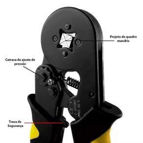 Adequado para terminais de 0,25 a 10mm Quatro mandris para crimpagem quadrada Trava de segurança de liberação rápida Possui catraca e ajuste de pressão AWG - 23 - 7 Material: Metal e ABS Tamanho 17cm