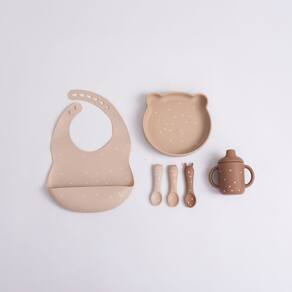 Material: silicone de grau alimentarCor: Marrom com detalhes Conteúdo: 1 prato com ventosa, 1 copo com alças, 1 babador com cata-migalhas, 3 colheres de siliconeInstruções de uso: lave completamente antes de cada uso, com água morna e sabão/detergente neutro ou na máquina de lavar. Sempre inspecione o produto antes de cada uso e descarte ao primeiro sinal de dano. Sempre use o produto sob supervisão de um adulto. Verifique a temperatura do alimento antes de oferecer à criança.Orientações de cuidado: seguro para máquina de lavar louças, forno e micro-ondas (de -20°C até 240°C). Não utilize produtos de limpeza abrasivos. Não armazene ou manuseie com objetos cortantes. Armazene em ambiente seco e arejado. Mantenha esta embalagem para futuras consultas.