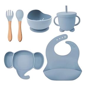 Ofereça praticidade e segurança para a alimentação do seu bebê com este completo kit de alimentação infantil em silicone. Ideal para bebês, o conjunto é composto por seis peças essenciais para o dia a dia: prato, copo, talheres, babador e pote.
