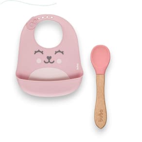 Kit alimentacao colher silicone e bambu e babador introdução alimentar infantil bebe versátil Cor: rosa Kit colher de silicone e bambu da buba + babador de silicone gumy
