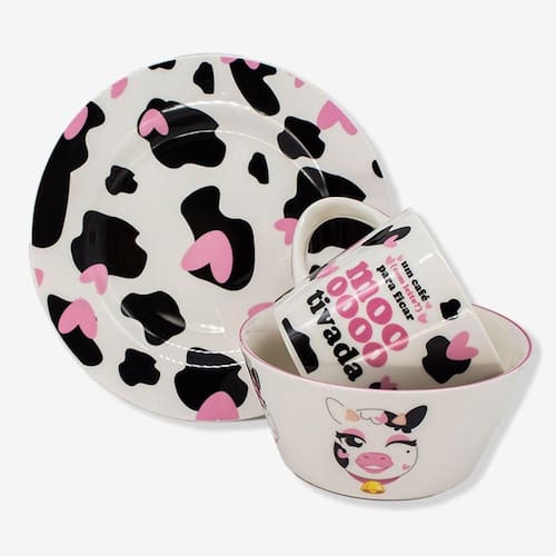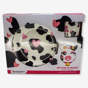 Kit Alimentação Vaquinha Zonacriativa Depois de um dia cheio de aventuras descobrindo coisas novas, você precisa de uma mãozinha para matar sua fome? A gente te ajuda! Com um bowl, caneca e prato, esse é o kit perfeito para te acompanhar durante as suas refeições! Não importa se é no café da manhã, almoço ou janta, adicione diversão e criatividade em todas as suas garfadas! O produto é importado, feito em cerâmica, possui detalhes incríveis que vão fazer você se apaixonar! Se você quer uma ajudinha para completar suas refeições com um tempero de diversão e criatividade, a gente te ajuda! Com uma caneca de 300ml para o seu café ou suco, um bowl de 300ml para seus cereais ou frutinhas e um prato para as suas refeições! Não importa se é no café, almoço ou janta, esse kit te acompanha em todas as suas refeições!