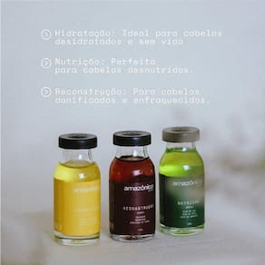 Descrição: O Kit Ampolas Hidratação, Nutrição e Reconstrução da Amazônico Care é a solução completa para cabelos saudáveis e radiantes. Este kit contém três ampolas de tratamento intensivo, cada uma com 15ml, para atender às necessidades específicas do seu cabelo. Indicação: O Kit Ampolas da Amazônico Care é indicado para todos os tipos de cabelo. Cada ampola atende a uma necessidade específica: - Ampola Hidratação: Ideal para cabelos desidratados e sem vida. - Ampola Nutrição: Perfeita para cabelos que precisam de nutrição profunda. - Ampola Reconstrução: Essencial para cabelos danificados e enfraquecidos. Tecnologia: Cada ampola deste kit contém ativos poderosos: - Ampola Hidratação: Com óleo de pracaxi, extrato de bambu e extrato de babosa para proporcionar hidratação intensa. - Ampola Nutrição: Com óleo de uva, óleo de coco e óleo de abacate para nutrir profundamente os fios. - Ampola Reconstrução: Com colágeno, Queratina e proteína do trigo para fortalecer e reconstruir a estrutura capilar. Benefícios: - Tratamento personalizado para o seu tipo de cabelo - Hidratação intensa - Nutrição profunda - Reconstrução capilar - Fios mais fortes e saudáveis - Cabelos radiantes - Fácil aplicação - Resultados visíveis em minutos Modo de Uso: 1. Após lavar os cabelos com shampoo, retire o excesso de água com uma toalha. 2. Escolha a ampola adequada com base nas necessidades do seu cabelo. 3. Quebre a ampola e aplique o conteúdo uniformemente nos cabelos, evitando a raiz. 4. Massageie suavemente e deixe agir por 3 a 5 minutos. 5. Enxágue abundantemente. 6. Use as ampolas conforme a necessidade do seu cabelo. Resultado: Com o uso do Kit Ampolas Hidratação, Nutrição e Reconstrução da Amazônico Care, seus cabelos ficarão hidratados, nutridos, reconstruídos, mais fortes e saudáveis. Este kit é a chave para cabelos radiantes e cheios de vida. Itens Inclusos: 1 Ampola Hidratação 15ml - Ampolas Amazônico Care 1 Ampola Nutrição 15ml - Ampolas Amazônico Care 1 Ampola Reconstrução 15ml - Ampolas Amazônico Care Precauções: Evite o contato com os olhos. Em caso de contato, enxágue abundantemente com água. Mantenha fora do alcance de crianças. Uso externo. Em caso de irritação, suspenda o uso. Guarde em local fresco e ao abrigo da luz solar direta. Marca: Amazônico Care Ean: 7895161500017