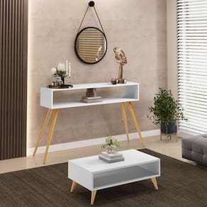 O conjunto de Aparador Mônaco com Mesa de Centro Cannes Pés Palito Branco, da Lyam Decor, é a escolha perfeita para adicionar estilo e funcionalidade à sua sala de estar. Com seus pés palito e design retrô, esse conjunto irá encantar os amantes de decoração vintage. A mesa de centro possui um nicho espaçoso, proporcionando espaço adicional para armazenar revistas, controles remotos e outros itens essenciais do dia a dia. Além disso, sua superfície generosa é perfeita para acomodar bandejas de petiscos durante as noites de filmes ou para exibir objetos decorativos que reflitam sua personalidade única. Já o aparador versátil é um destaque por si só. Com seu nicho, ele oferece uma solução prática para organizar seus pertences e manter sua sala de estar arrumada. Seja na sala de estar, recepção, hall de entrada ou corredor, esse aparador adiciona um toque retrô e elegante a qualquer ambiente. Com esse jogo de Aparador com Mesa de Centro, você terá não apenas móveis funcionais, mas também peças que agregam estilo e personalidade ao seu espaço. Não deixe essa oportunidade passar e garanta já o seu kit! Transforme sua sala de estar em um ambiente acolhedor e cheio de charme hoje mesmo!