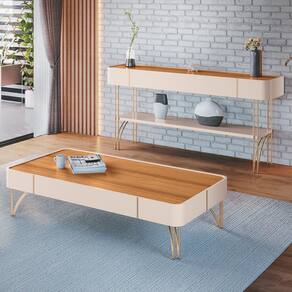 Seguindo a tendência dos móveis com design orgânico, esse conjunto de aparador e mesa de centro traduzem cada detalhe em elegância. A começar pelos cantos arredondados, seguido pela delicadeza das laterais com filetes decorativos e os pés de aço maciço com acabamento em tom dourado, dando um toque de sofisticação ao estilo industrial. Para completar, além de comporem a decoração do ambiente, ainda são funcionais, já que você pode dispor objetos decorativos ou aproveitá-los como apoio para outros fins.