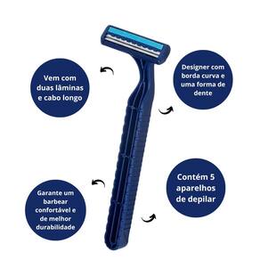 O Aparelho de Barbear GT-2 possui um designer com borda curva e uma forma de dente. Esse formato garante um barbear confortável e de melhor durabilidade em comparação com outros produtos. Contém 5 aparelos de barbear, com 2 lâminas, fita lubrificante e cabo longo.