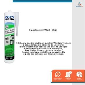 O Silicone acético multiuso incolor 270 ml da Tekbond é considerado um silicone de uso geral, muito utilizado na construção civil na vedação e selagem de pias e vasos sanitários, box em banheiros, portas e janelas. Possui excelente resistência aos raios UV e pode ser aplicado em áreas externas.