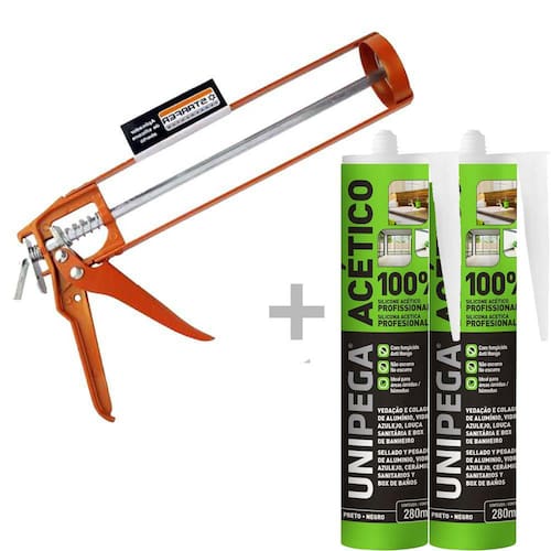 Aplicador de silicone aberto 9 Polegadas (230mm) - STARFERCorpo em aço carbono, cabo em ligar de aluminio e acabamento pintado laranja.Indicado para aplicar silicone (massa) e outros produtos comercializados em tubo.O aplicador para tubo de silicone da Starfer, é a ferramenta certa para você que trabalha na construção civil ou com pequenos reparos.Utiliza tubos de silicone até 280g ou 9 Polegadas (230mm).Marca.: StarferRef.: 02002728Silicone Acético Multiuso Preto 280ml UnipegaSilicone Acético Multiuso Preto 280ml Unipega Indicado para vedação e colagem de alumínio, vidro, azulejo, louça sanitária e box de banheiroCaracterísticas Gerais do Produto:• Alongamento: 300 % (Após cura)• Tempo de formação de película: 10 min.• Tensão de Ruptura: 1,0 MPa (Após cura)• Composição: Polidimetilsiloxano / Metiltriacetoxissilano / Diacetato de dibutil estanho• Cura total: 24 horas• Densidade: 0,96 g/cm3• Dureza Shore A: 17 (Após cura)• Embalagem: Tubo• Temperatura: -30oC / +120oC (Após cura)• Tipo: Acético• Cor Predominante: Preto• Conteúdo: 280ml• Marca: Unipega• EAN: 7898994501466• Modelo: MultiusoAcompanha o produto:• 02 - Silicone Acético Preto 280ml Unipega• 01 - Aplicador de silicone aberto StarferRef.: 3683664Marca: Unipega