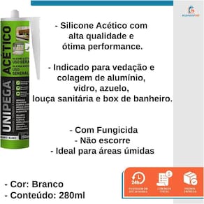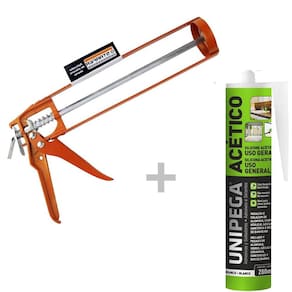 Aplicador de silicone aberto 9 Polegadas (230mm) - STARFERCorpo em aço carbono, cabo em ligar de aluminio e acabamento pintado laranja.Indicado para aplicar silicone (massa) e outros produtos comercializados em tubo.O aplicador para tubo de silicone da Starfer, é a ferramenta certa para você que trabalha na construção civil ou com pequenos reparos.Utiliza tubos de silicone até 280g ou 9 Polegadas (230mm).Marca.: StarferRef.: 02002728Silicone Acético Multiuso Branco 280ml UnipegaSilicone Acético Multiuso Branco 280ml Unipega Indicado para vedação e colagem de alumínio, vidro, azulejo, louça sanitária e box de banheiroCaracterísticas Gerais do Produto:• Alongamento: 300 % (Após cura)• Tempo de formação de película: 10 min.• Tensão de Ruptura: 1,0 MPa (Após cura)• Composição: Polidimetilsiloxano / Metiltriacetoxissilano / Diacetato de dibutil estanho• Cura total: 24 horas• Densidade: 0,96 g/cm3• Dureza Shore A: 17 (Após cura)• Embalagem: Tubo• Temperatura: -30oC / +120oC (Após cura)• Textura: Sólido pastoso branco• Tipo: Acético• Cor Predominante: Branco• Conteúdo: 280ml• Marca: Unipega• EAN: 7898994501459• Modelo: MultiusoAcompanha o produto:• 01 - Silicone Acético Multiuso Branco 280ml Unipega• 01 - Aplicador de silicone aberto StarferRef.: 3683656Marca: Unipega