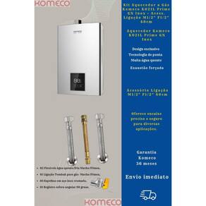 1 Kit Aquecedor KO21PRIME 21L GN + Acess. Ligação De Aquecedor A Gás Komeco M1/2" F1/2" 40cm (02 Flexíveis de 40cm para água quente ou fria (1/2 pol. Macho / Fêmea), 01 Ligação Tomback de 40cm (1/2 pol. Macho / Fêmea) para gás, 03 Espelhos em aço inox cromado e 01 Registro esfera angular em L )