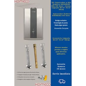 1 Kit Aquecedor Komeco 36DIG2 36L GN + Acess. Ligação De Aquecedor A Gás Komeco M1/2" F1/2" 40cm (02 Flexíveis de 40cm para água quente ou fria (1/2 pol. Macho / Fêmea), 01 Ligação Tomback de 40cm (1/2 pol. Macho / Fêmea) para gás, 03 Espelhos em aço inox cromado e 01 Registro esfera angular em L )