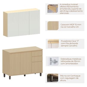 • Pintura: Armário: 3 Prateleiras Interna/Dobradiças Metálicas 35 mm com Amortecimento/3 Puxadores J em MDF 18 mm; Balcão: 1 Prateleira Interna/5 Puxadores J em MDF 18 mm/Pés na Cor Conhaque com Regulagem de Altura;