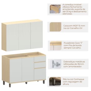 O Kit Armário e Balcão Aurora 120 cm é a combinação perfeita de elegância e praticidade para transformar sua cozinha. Com design moderno e acabamento em pintura UV, as peças oferecem um visual sofisticado e duradouro. O armário aéreo conta com 3 portas com dobradiças metálicas com amortecimento, puxadores em MDF e três prateleiras internas que garantem excelente organização dos itens do dia a dia. Já o balcão sem tampo possui 3 portas, 2 gavetas com corrediças telescópicas, prateleira interna e pés com regulagem de altura na cor conhaque, unindo funcionalidade e charme em um só móvel. Ideal para quem busca um ambiente bonito, eficiente e pronto para ser personalizado.